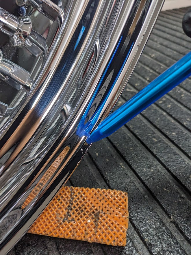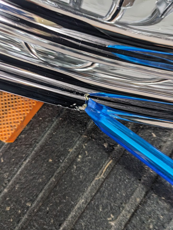 Beautiful 18x5.5 dual disc fat spoke wheel with an unfortunate defect in the chrome on two very small areas on the lip on one side of the wheel.